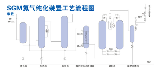 氮氣純化系列裝置 氣體純度:≥99.9995% 氧含量:≤2ppm 二氧化碳含量:≤1ppm 露點:≤-60℃ 技術特點: 若用戶所需氮氣摜標大于99.999%時,在我公司制氮機設備的基礎上配置純化設備。本系列產品采用碳載脫氧催化劑,不需消耗氫氣源,碳與氮氣中的余氧反應生成二氧化碳,再采用變壓吸附工藝除去二氧化碳和水,經過濾后得到高純度氮吸附工藝除去二氧化碳和水,經過濾后得到高純度氮氣。高純度氮氣技術指標可達O2≤2ppm,CO2≤1ppm,露點≤-60℃。